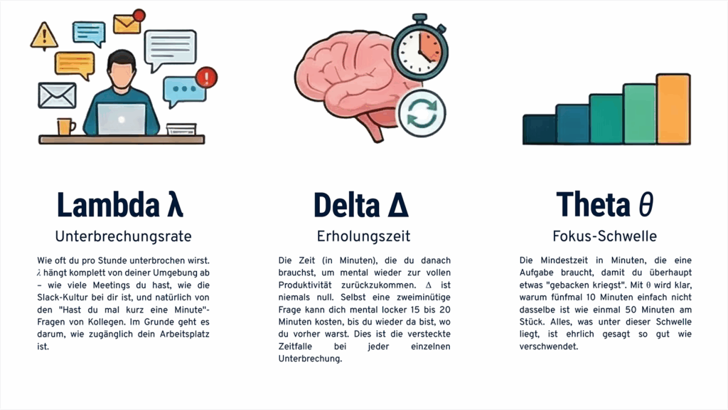 | λ(Lambda) | Unterbrechungsrate | Wie oft du pro Stunde unterbrochen wirst. λ hängt komplett von deiner Umgebung ab – wie viele Meetings du hast, wie die Slack-Kultur bei dir ist, und natürlich von den „Hast du mal kurz eine Minute“-Fragen von Kollegen. Im Grunde geht es darum, wie zugänglich dein Arbeitsplatz ist. |