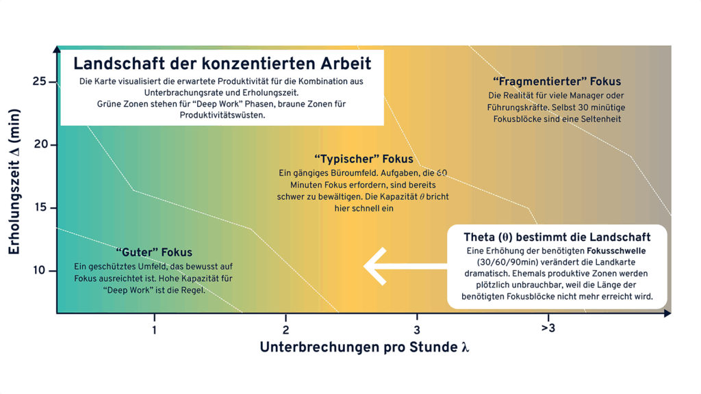- Reduzierst Du θ von 60 Min. auf 30 Min. in dem nervigen Szenario von eben, fallen plötzlich wieder zwei volle Arbeitsblöcke in deine Fokusschwelle.