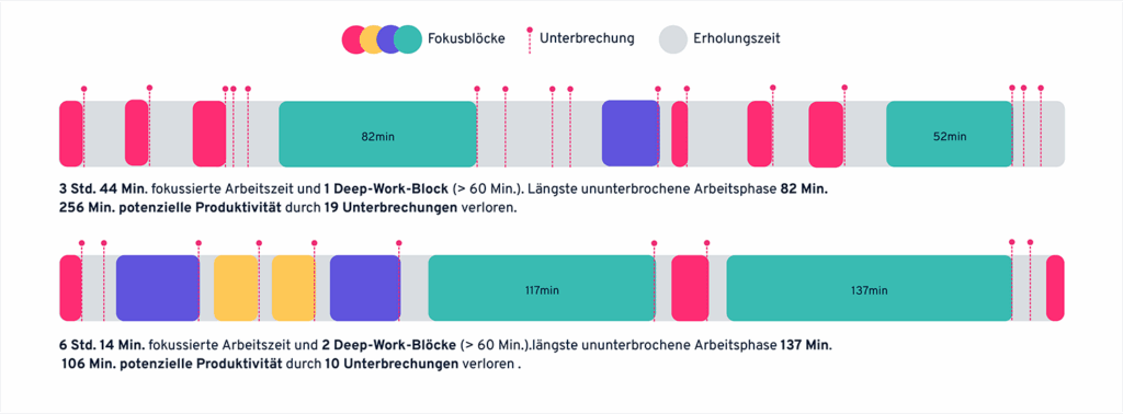 Ein schlechter Tag liefert 19 Unterbrechungen. Das Ergebnis: Nur ein einziger Block, in dem du dich mal wirklich konzentrieren konntest, obwohl du fast vier Stunden Fokuszeit hattest. Ein guter Tag mit der Hälfte an Unterbrechungen liefert zack über sechs Stunden Fokuszeit und drei richtig fette Deep Work Arbeitsblöcke.